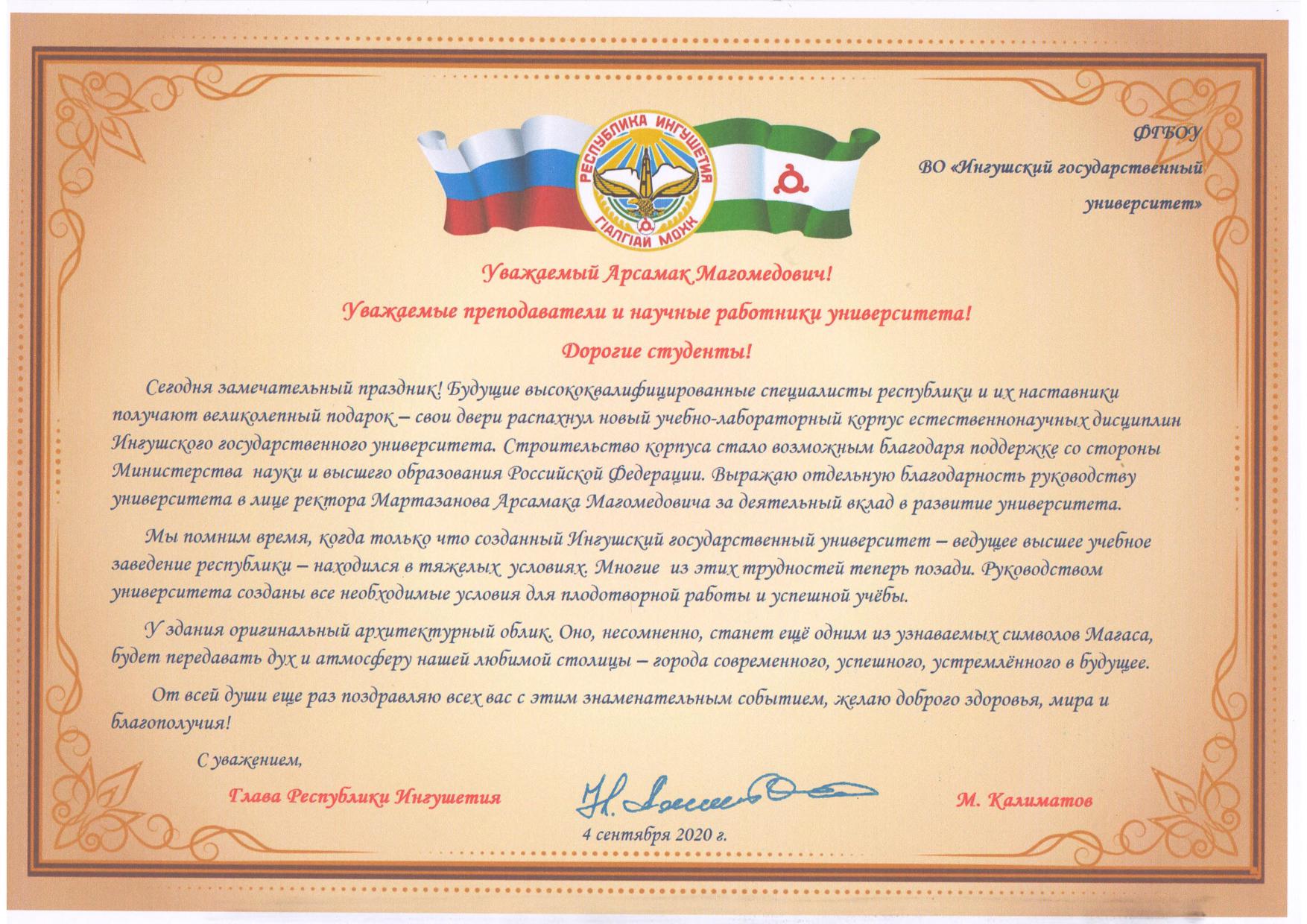 С приветственным адресом от Главы Республики Ингушетия Махмуд-Али Калиматова выступил руководитель Администрации Главы РИ Джамбулат Оздоев, который отметил, что: «Сегодня большой и яркий праздник – будущие высококвалифицированные специалисты и их наставники получают великолепный подарок. Руководством университета созданы все необходимые условия для плодотворной работы и успешной учёбы. Поздравляю Вас с знаменательным событием, желаю мира и благополучия».
