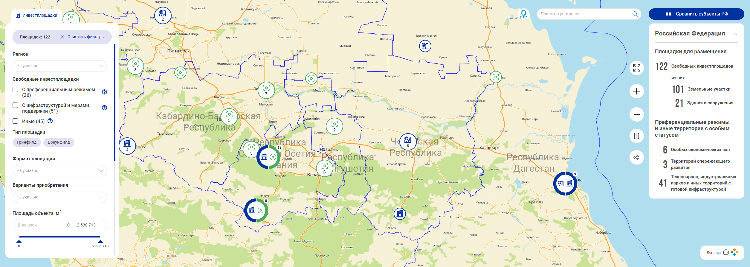https://investmap.economy.gov.ru/map собрана информация о свободных инвестиционных площадках, их инфраструктуре, действующих мерах государственной поддержки, вариантах приобретения земельного участка, здания или помещения. В карту встроены фильтры, которые упрощают поиск объектов. Подходящую инвестплощадку можно найти, отсортировав объекты по формату, площади, стоимости, преференциальным режимам или просто выбрав интересующую локацию. В карточке отражена детальная информация по объекту: возможность техприсоединения к инженерным коммуникациям, необходимый пакет документов для подачи заявки, налоговые льготы. Раздел «Деловое окружение» позволяет узнать какие объекты потребительского рынка, преференциальные зоны и полезные ископаемые находятся в непосредственной близости от выбранной инвестиционной площадки. В разрезе каждого субъекта представлена статистика для оценки инвестиционной привлекательности региона. На карту нанесены аналитические слои, отражающие информацию о средней заработной плате, плотности населения и зонах покрытия сотовой связью. Можно сравнить несколько субъектов РФ по их расположению в нацрейтинге инвестиционной привлекательности, количеству преференциальных режимов, уровню тарифов и налогов. «Сейчас на инвестиционной карте доступны более 120 свободных площадок для ведения бизнеса в СКФО. Функционал системы позволяет инвестору проанализировать условия реализации своего инвестпроекта в разных регионах, узнать о доступных мерах поддержки и подать заявку на подходящую инвестплощадку. Это новый удобный инструмент для инвестора, с помощью которого можно подобрать локацию для бизнеса, а также выявить факторы, которые могут повлиять на развитие проекта», – отметил Директор Департамента социально-экономического развития Северо-Кавказского федерального округа Игорь Храновский.