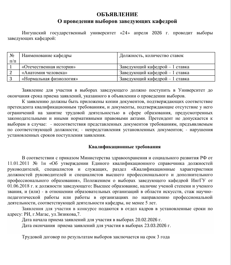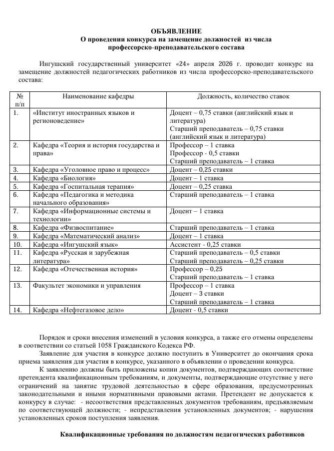 Квалификационные требования к должностям педагогических работников, относящихся к профессорско-преподавательском составу в ФГБОУ ВО" Ингушский государственный университет"